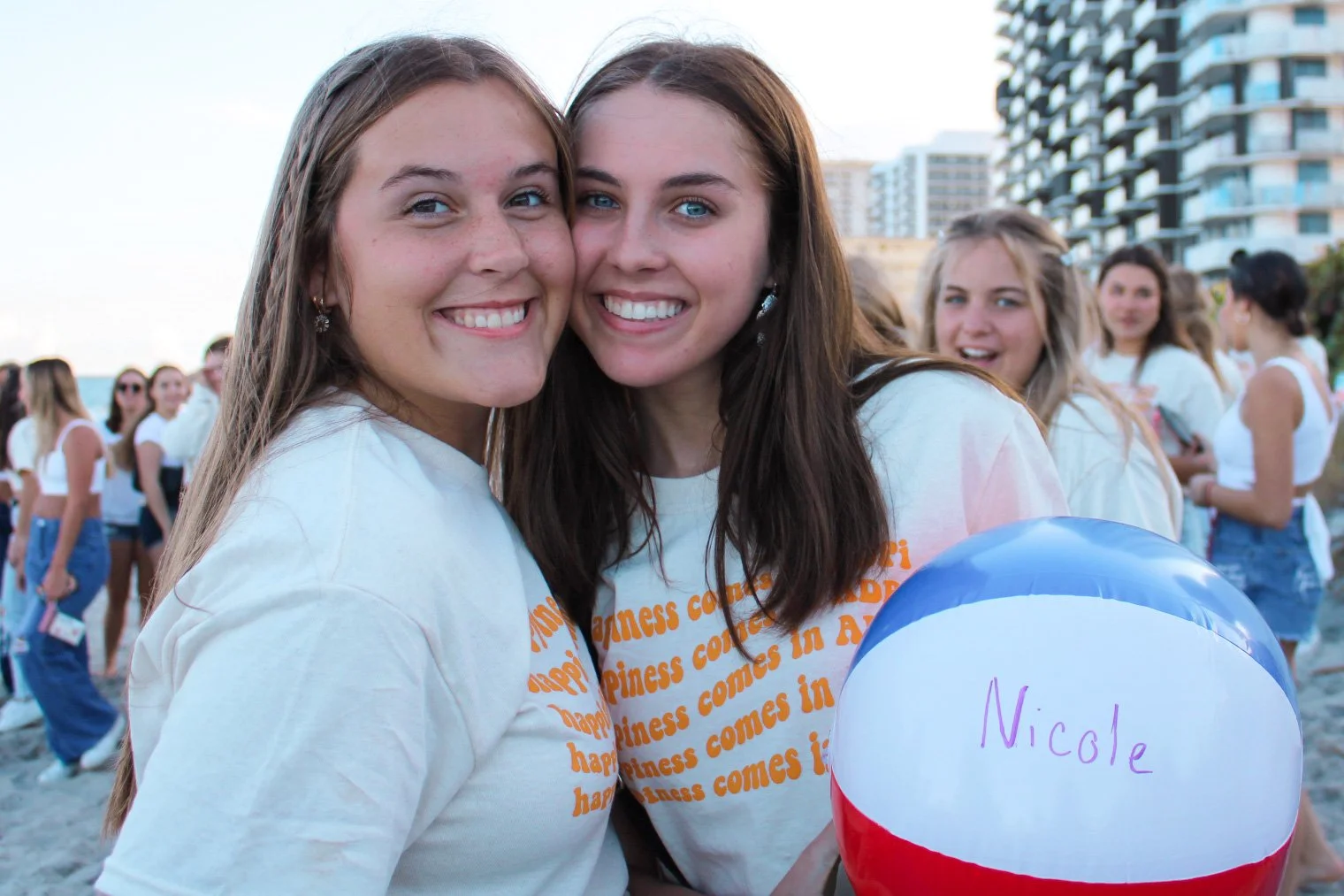 I chose to do a pale yellow shirt to fit with a happy and warm toned aesthetic, and added a warm toned orange text to match the beautiful sunset that would be in the background of the photos. I decided on a waved mesh text again to match our beach themes. The inspiration for the design was a similar shirt we had seen on Pinterest that said “Happiness comes in waves”, so we adapted ours to say “Happiness comes in ADPi”.
